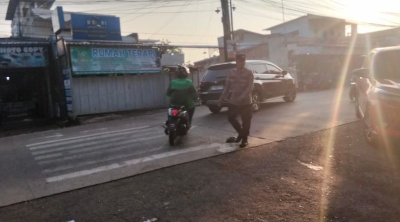 Anggota Polsek Taktakan Polresta Serkot Berikan Kelancaran Di Depan SMAN 3 Kota Serang di pagi hari.