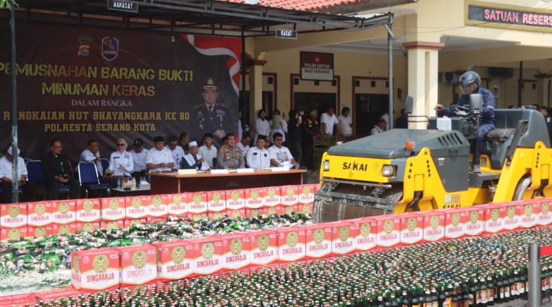 POLRESTA SERKOT_ Dalam rangka memperingati Hari Bhayangkara ke-80, Polresta Serang Kota melaksanakan kegiatan pemusnahan barang bukti berupa ribuan minuman keras (miras). Kegiatan tersebut dipimpin langsung oleh Kapolresta Serang Kota, Yudha Satria, S.H., S.I.K., M.H., bertempat di depan Gedung Satreskrim Polresta Serang Kota pada kamis, 30/04/26.